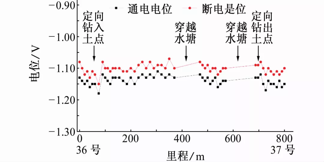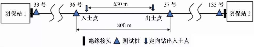 管道采用外加电流阴极保护方式,定向钻段管道在36和37号测试桩中间,管段的入土点距离36号测试桩约为62m,出土点距离37号测试桩约为108m。