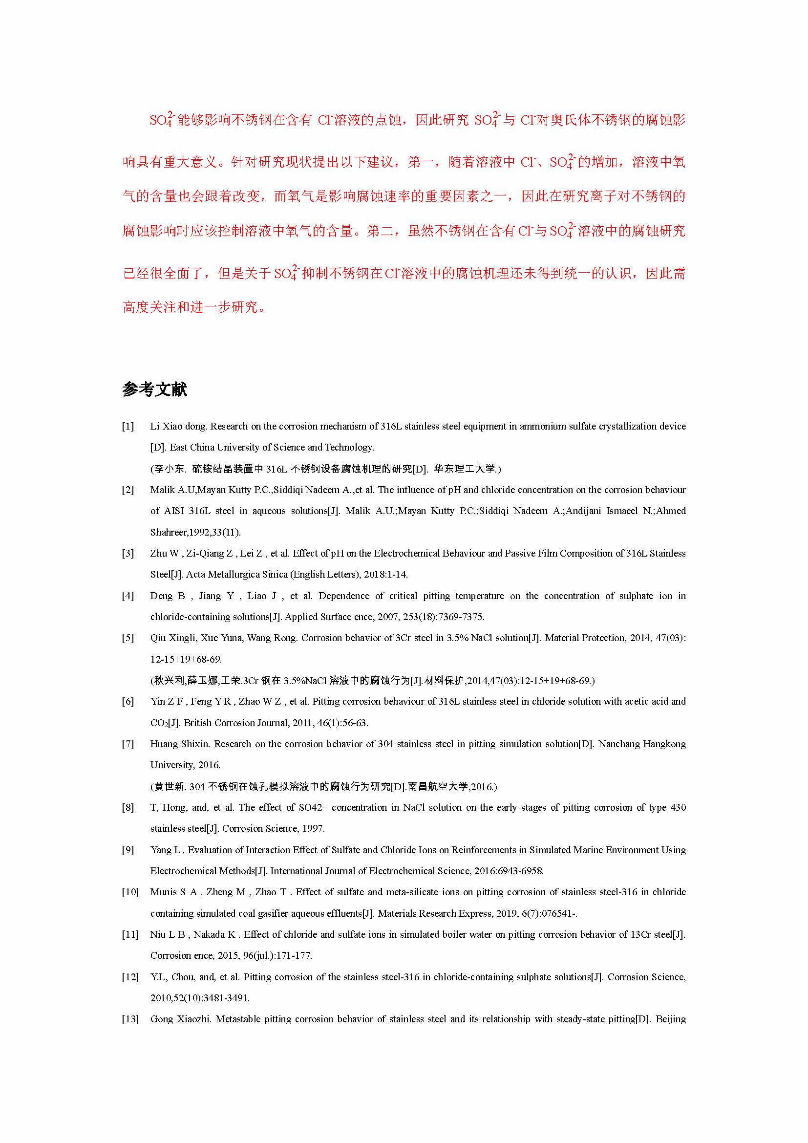 硫酸根对不锈钢在含氯离子溶液中的腐蚀影响研究进展