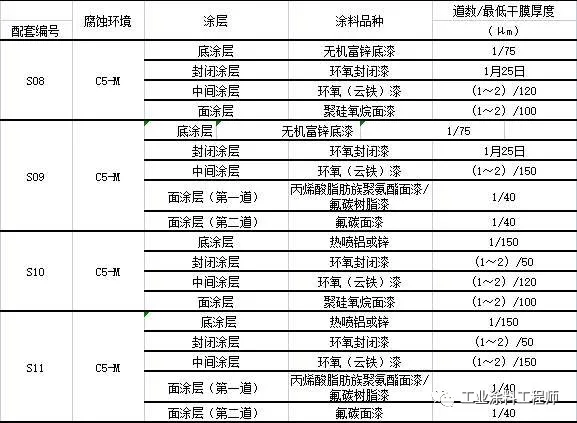 表1中的S10和S11配套体系底漆为热喷铝(锌),实际施工中考虑到热喷锌或热喷铝的环保问题、能耗问题以及工人健康问题,此配套体系目前采用的不多,但热喷铝应用在螺栓栓接部位的案例还很多。另外,从机理上分析,热喷铝涂层不建议后续再涂装较厚的涂层,一般情况下仅推荐涂装一道封闭漆,主要是由于在有机涂层下铝腐蚀会形成氯化铝,而在水的存在下,腐蚀产物氯化铝是高度不稳定的,并与水反应生产盐酸,会导致更加活跃的腐蚀。