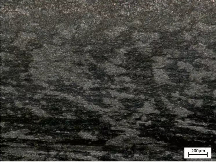 结合金相组织与体视学形貌的观察结果,可判定外圆周面向内平滑段裂缝其实并非真正的裂纹,而是符合热锻成形工艺中产生的高温折叠特征,并伴有一定深度的氧化与脱碳现象。对同批次未经使用的新螺栓进行抽检,螺栓圆柱头部也发现了折叠缺陷,如图7所示。试样经侵蚀后发现,折叠附近的微观组织结构具有与折叠大致平行的加工流线特性,具有明显的高温脱碳特征,且存有一处较大的氧化物夹渣,如图8所示。