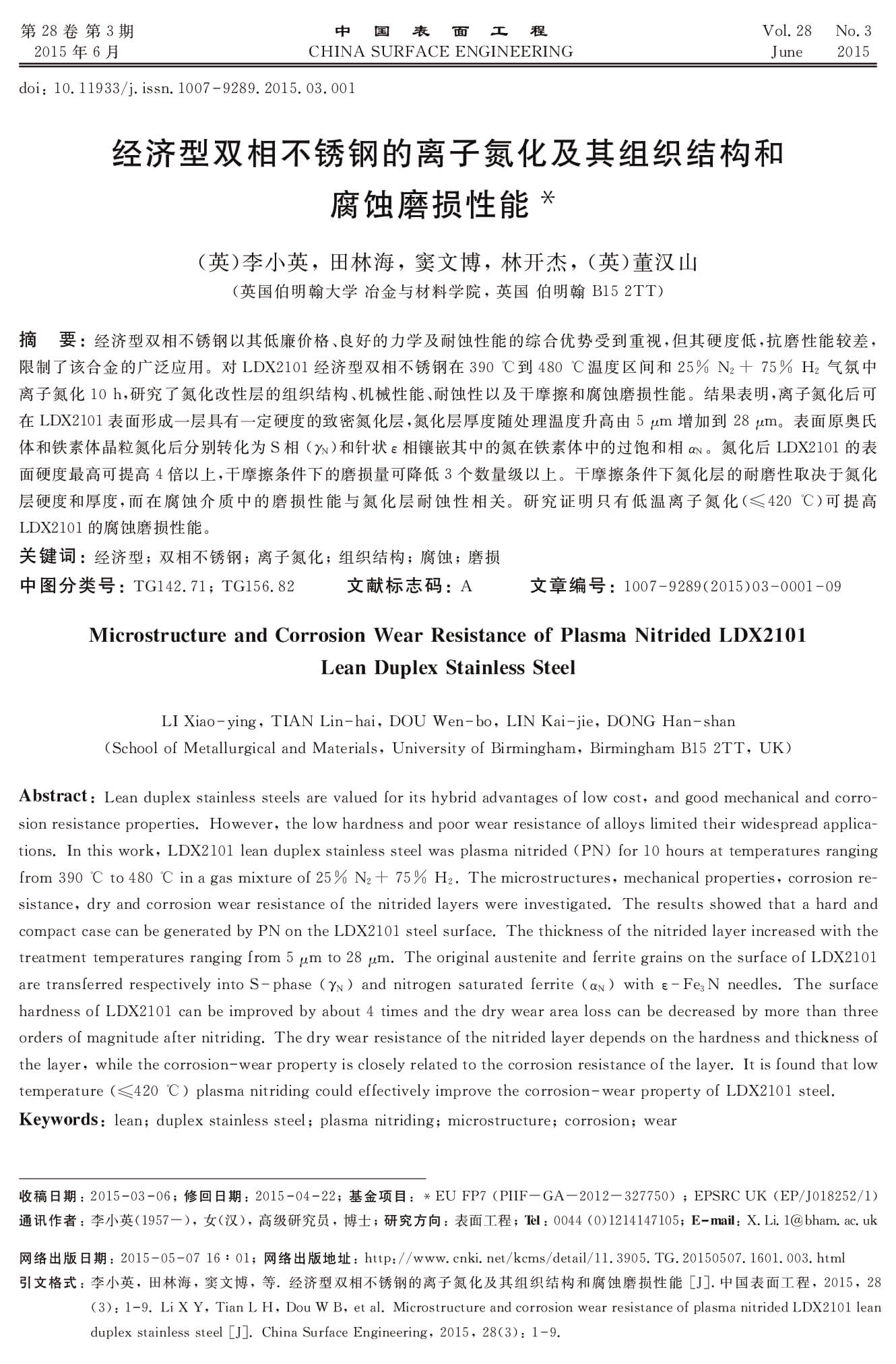 经济型双相不锈钢的离子氮化及其组织结构和腐蚀磨损性能