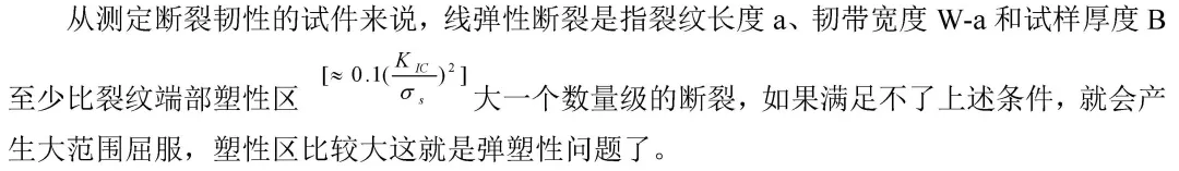 在线弹性断裂力学中,虽然也指出裂纹尖端不可避免地存在一个塑性区,用有效裂纹长度,把小范围屈服经过弹性化处理,进行塑性区修正,使线弹性断裂力学得出的应力强度因子KI仍然适用。但是,对于前述弹塑性断裂问题,即使引入塑性区修正,线弹性断裂力学方法也已不再适用。