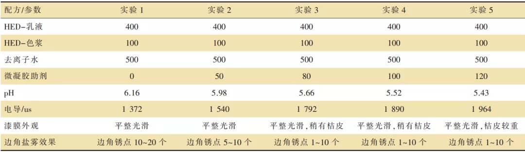 实验用电泳涂料用工作液按表1配制。研究微凝胶助剂的不同添加比例对工作液的pH、电导以及电泳漆泳板后对漆膜外观、漆膜盐雾性能的影响。