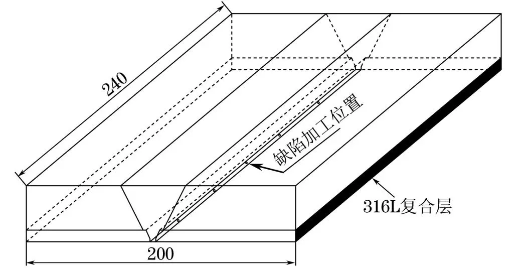 图5 焊缝试块结构及缺陷分布示意(缺陷位于焊缝中心)