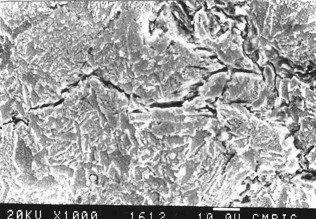 内壁热影响区靠近母材一侧焊接回火区的裂纹断口形态,为混合断口。有的以穿晶为主,带有大量的沿晶二次裂纹。有的又以沿晶为主,带有大量的明显的鸡爪形花样。