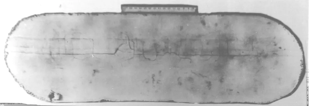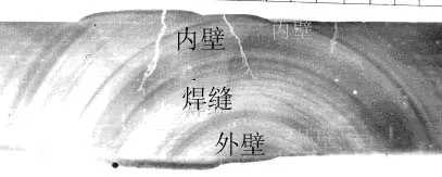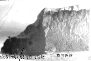 壳体下部开裂部位的宏观形态见图5-55,剖面开裂情况见图5-56,将带裂纹的试样沿裂纹掰开后的断口宏观形态见图5-57。