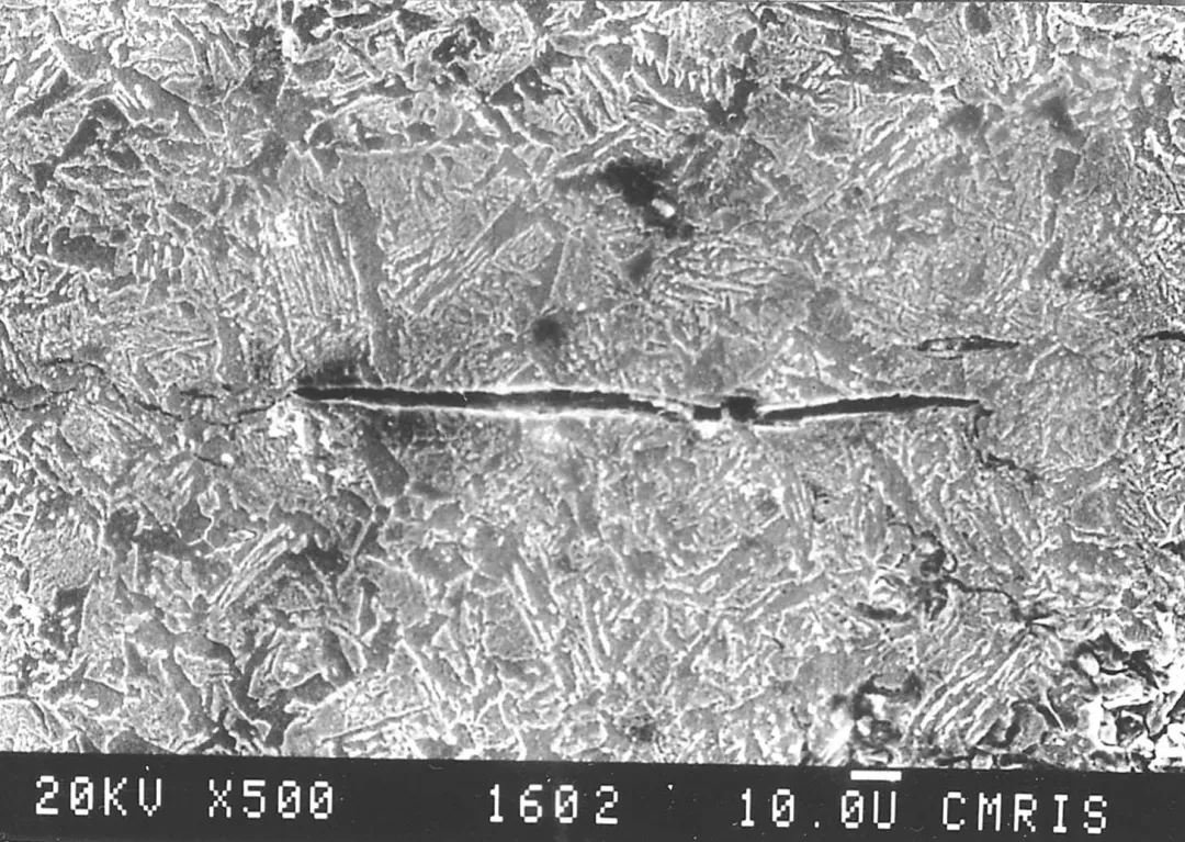 图5-58为剖面上的氢致裂纹,大裂纹的尖端两侧都有扩展的细小裂纹,图5-59为氢致裂纹的尖端,细小裂纹呈断续层状,已经开始出现沿晶的特征,并逐步连接在一起。图5-60为金属内部的MnS夹杂处氢致裂纹,MnS脱落,由于积聚的氢压不足不能引起两端开裂,图5-61为氢致裂纹在金属内部的MnS夹杂处,MnS还没有脱落,一端已经开裂。