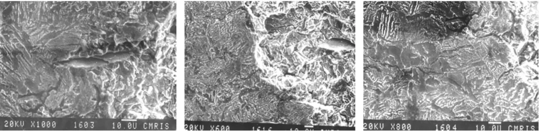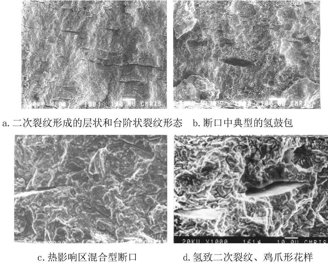 图5-62为母材和热影响区的断口宏观形态,为混合断口。有的以穿晶为主带有大量的二次裂纹形成的层状和台阶状裂纹,断口中有典型的氢鼓包。热影响区断口为混合型断口,氢致沿晶二次裂纹,有明显的鸡爪形花样。