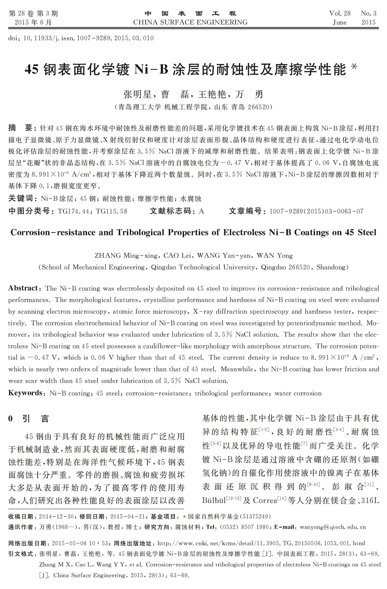 45钢表面化学镀Ni-B涂层的耐蚀性及摩擦学性能