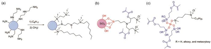 Fig.1   Schematic presentation for synthesis of quaternary ammonium polyethyleneimine nanoparticles[38,39] (a), surface modified silica nanoparticles[40] (b) and macromonomers synthesized by a sol-gel chemical route (c)[43]