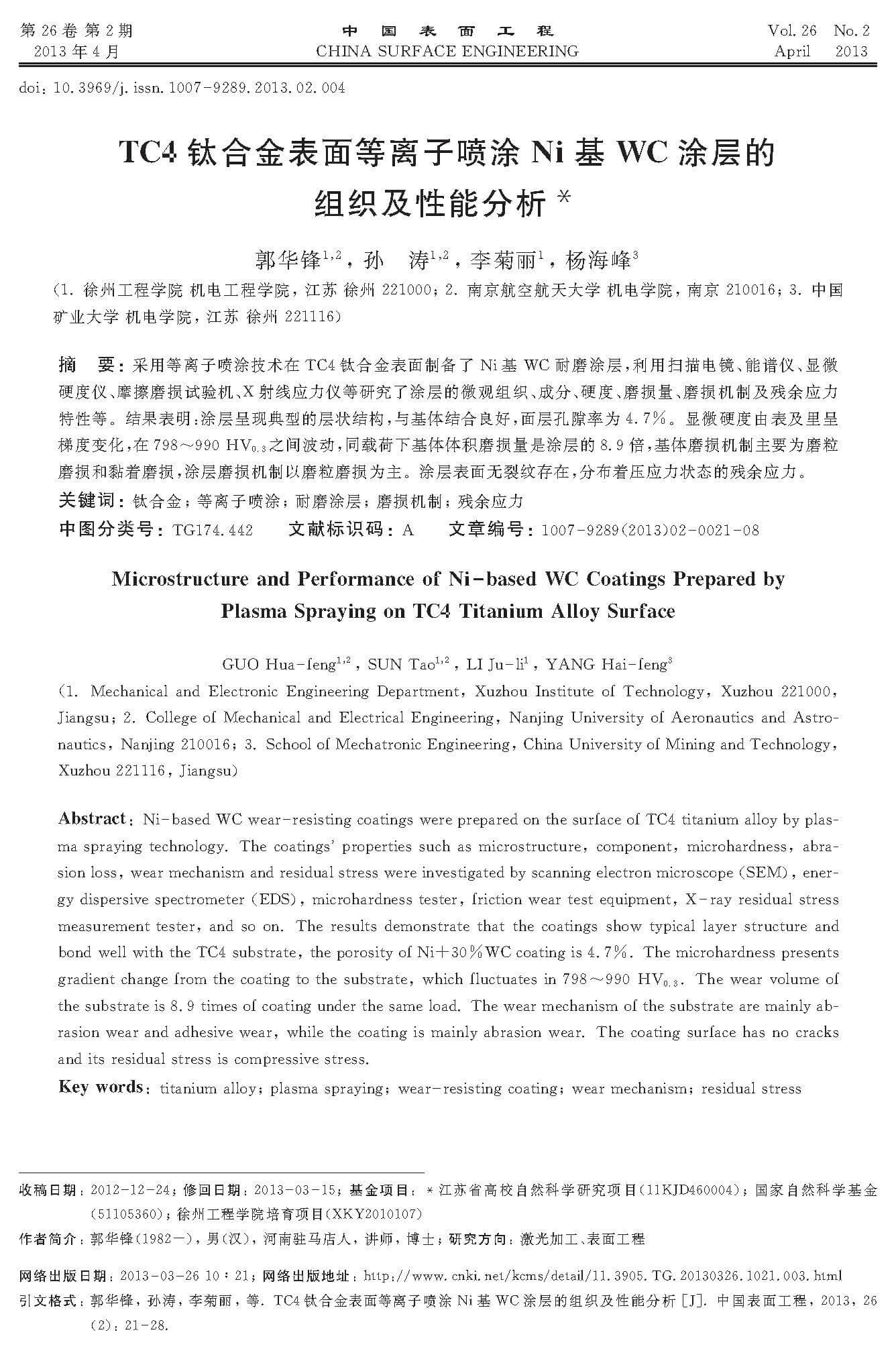 TC4钛合金表面等离子喷涂Ni基WC涂层的组织及性能分析
