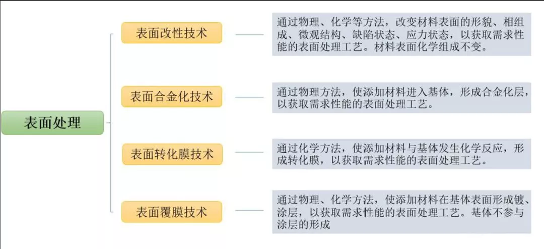 总共可以分为4大类:表面改性技术、表面合金化技术、表面转化膜技术和表面覆膜技术。