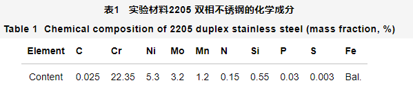 实验用热轧态2205双相不锈钢板材的的厚度为14 mm,其化学成分列于表1。