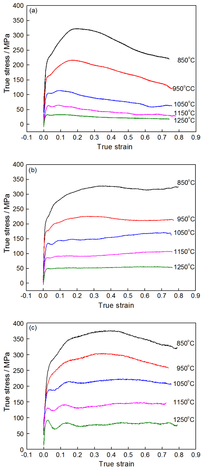 Fig.1 Stress-strain curves of 2205 DSS under different hot compression conditions (a) ?=0.1 s-1 (b) ?=1 s-1 (c) ?=10 s-1