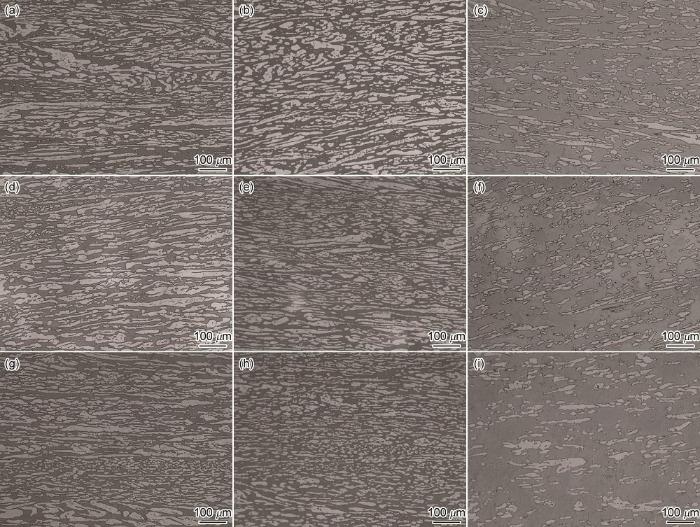 Fig.2 Optical microstructure of specimens under different hot compression conditions with a strain of 0.8 (a) 850℃, (b) 1050℃, (c) 1250℃ at the strain rate of 0.1 s-1; (d) 850℃, (e) 1050℃, (f) 1250℃ at the strain rate of 1 s-1; (g) 850℃, (h) 1050℃, (i) 1250℃ at the strain rate of 10 s-1