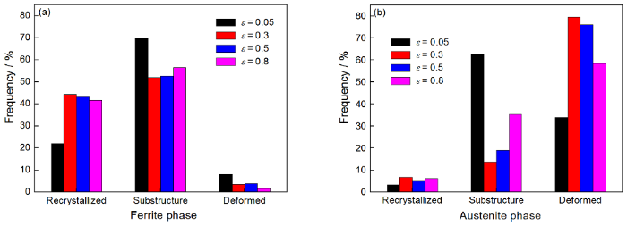 使用EBSD分析软件统计了不同变形量条件下奥氏体和铁素体两相中再结晶、亚晶及变形晶粒三种类型晶粒数量的变化,结果如图8所示。对于铁素体相,随着变形量的增加其晶粒主要以再结晶晶粒和亚结构为主,变形晶粒逐渐被再结晶晶粒和亚晶结构所替代。因此,在热变形过程中铁素体相是以动态回复和动态再结晶的方式进行软化。对于奥氏体,在不同的应变情况下其再结晶晶粒所占的百分比变化不大且都很低,奥氏体晶粒主要为变形晶粒和亚结构。由于奥氏体的层错能较高,位错难以发生交滑移,奥氏体相的动态回复行为受到很大程度的限制。从图8b可以看出,奥氏体相中变形晶粒的比例很大。随着变形量的增大再结晶晶粒的比例几乎不变,奥氏体只通过有限的动态回复使部分变形晶粒被亚结构所取代。综上所述,在本文的热变形条件下铁素体主要通过动态回复和动态再结晶两种方式软化,而奥氏体则通过有限程度的动态回复软化。