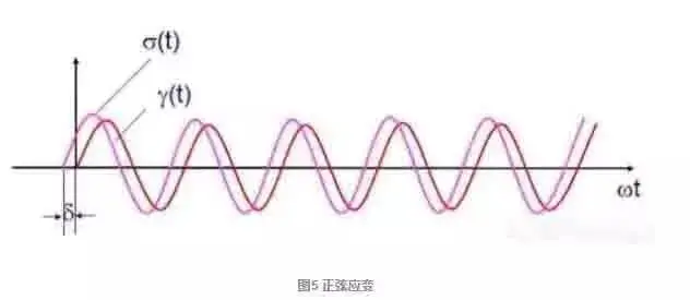 DMA是通过分子运动的状态来表征材料的特性,分子运动和物理状态决定了动态模量(刚度)和阻尼(样品在振动中的损耗的能量),对样品施加一个可变振幅的正弦交变应力时,将产生一个预选振幅的正弦应变,对粘弹性样品的应变会相应滞后一定的相位角δ,如图5所示。