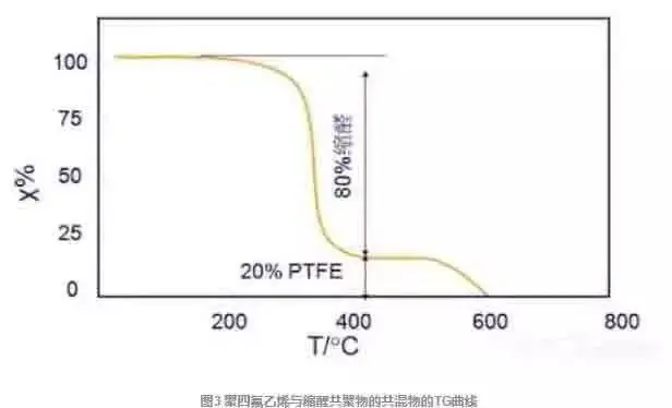 热重法因其快速简便,已经成为研究聚合物热变化过程的重要手段。例如图3中聚四氟乙烯与缩醛共聚物的共混物的TG曲线可以被用来分析共混物的组分,从图中可以发现:在N2中加热,300~350℃缩醛组分分解(约80%),聚四氟乙烯在550℃开始分解(约20%)。