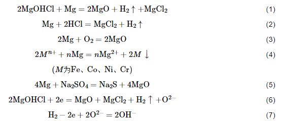 由于无水氯化镁具有较强的吸潮特性,MNKC熔盐在配制、熔融过程中所吸收的水会与氯盐发生水解反应,生成腐蚀性较强的MgOHCl和HCl,其中前者能稳定的存在于熔盐体系[6],并对金属造成较大的腐蚀危害。金属Mg作为强还原剂对熔盐中的水解产物、溶解氧、过渡金属离子、硫酸根离子等均有良好的去除效果 (见式 (1)~(5))。特别是水解产物和溶解氧,常规分析方法 (如ICP-OES、离子色谱等) 不便测量,但是对熔盐的腐蚀性往往是决定性的。