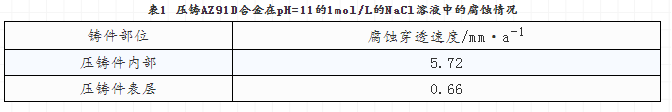 由于铸造过程的特殊性,熔融镁合金在被压入模腔前就已凝固出部分含铝极低的α相晶粒。当被挤入金属压力模腔后,由于流体力学的作用,这些固体的低含铝α相晶粒倾向于集中到铸件表层,剩下的液态镁合金含铝较高。进入金属模腔后,在与模腔壁接触时,由于金属模的高热容量,表层受金属模壁的冷却速度较大,快速凝固。所以,镁合金的压力铸造件的表面总是有一层快速凝固而形成的表面层,晶粒很细,相对富铝而β相的量较多,并且分布十分均匀,沿着晶间形成了几乎连续的β相网络。这样的表面层显然有利于该压铸件的抗腐蚀。相反,在压力铸造的镁合金内部,α相晶粒粗大,β相较少且分布不连续,所以不耐蚀。压铸AZ91D合金在pH=11的1mol/L的NaCl溶液中的腐蚀情况见表1。