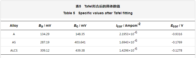 (3) ALCS合金的Ecor高,Icor低,阴阳极Tafel斜率大。合金系列的耐腐蚀性能顺序为:ALCS>AS>A。