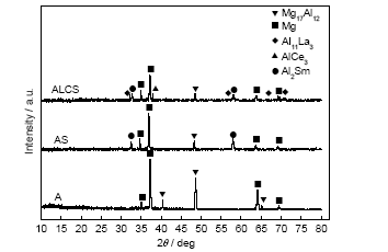 (1) A合金的主要物相组成为α-Mg、β-Mg17Al12,AS合金的的物相组成为α-Mg、β-Mg17Al12、Al2Sm,ALCS合金的物相组成除了α-Mg、β-Mg17Al12、Al2Sm相外,还会形成AlCe3以及Al11La3相。