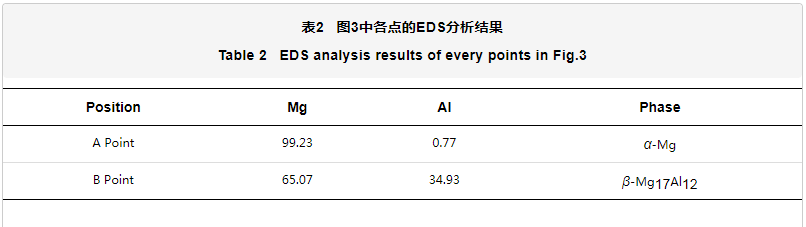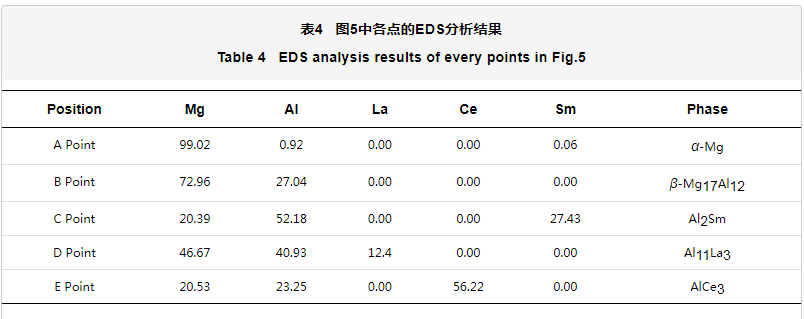 (2) Al2Sm相为亮白色的块状组织,Al11La3相为杆状组织,AlCe3相为针状组织。其中Al11La3相可起到钉扎作用,细化合金晶粒;AlCe3相使合金腐蚀表面的活性点减少,也可细化合金。