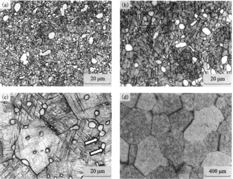 图5为TC21合金在不同固溶温度下的显微组织。由图5可知,随着固溶温度的升高,αp相的体积分数减少,当固溶温度高于Tβ后,αp相消失。在940℃固溶处理,由于等轴αp相的阻碍,β晶粒的晶界发生弯曲弓出,如图5(c)中的箭头所示。在1000℃固溶处理(>Tβ),αp相消失,由于β晶粒晶界移动的阻碍消失,β晶粒急剧长大,平均直径可达300μm左右,如图5(d)所示。
