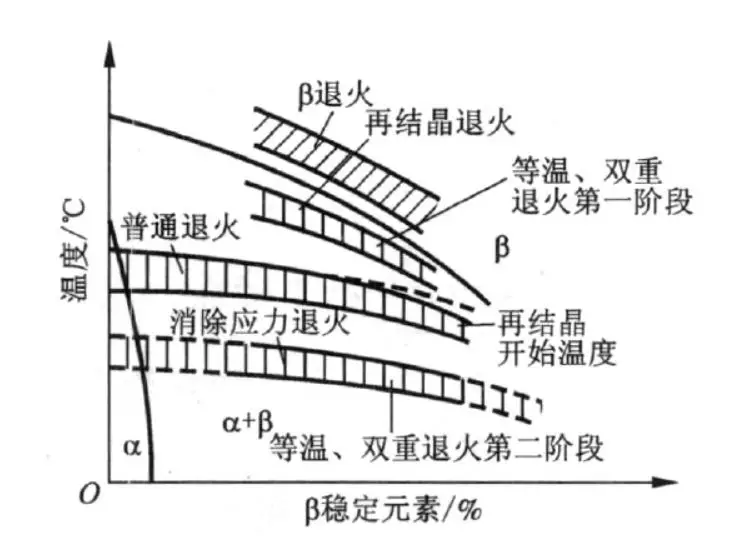 退火适用于各种钛合金,其主要目的是消除应力,提高合金塑性及稳定组织。退火的形式包括去应力退火、再结晶退火、双重退火、等温退火和真空退火等,钛合金各种方式退火温度范围如图1所示。