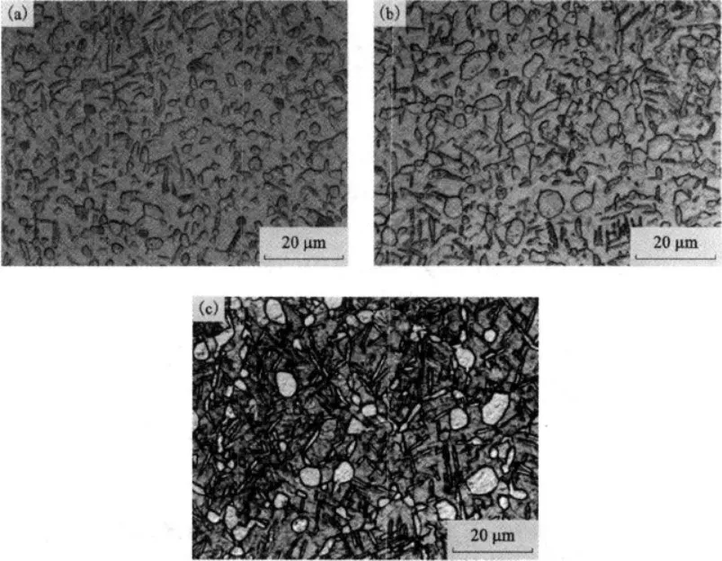 图6为TCIZ合金固溶处理4h空冷后的显微组织。由图6与图5(a)和(b)可知,随着固溶时间的增加,TC21合金中ap相的体积分数以及分布规律并没有发生显著的变化。由此可见,当固溶处理达到一定时间之后,TC21合金的显微组织对固溶处理时间不敏感,只是固溶处理温度对合金的固溶组织起着决定性的作用。