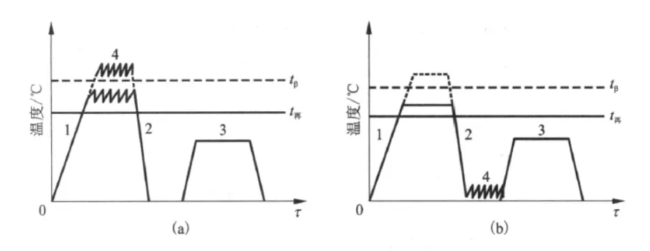 1-加热;2-水冷;3-时效;4-高或低温变形;tβ-β相变点;t再-再结晶温度
