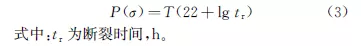 为分析材料的剩余使用寿命,采用参数外推法进行评估。当已知管壁的运行当量温度、应力,即可通过公式(3)估算管道的剩余使用寿命(即断裂时间)。