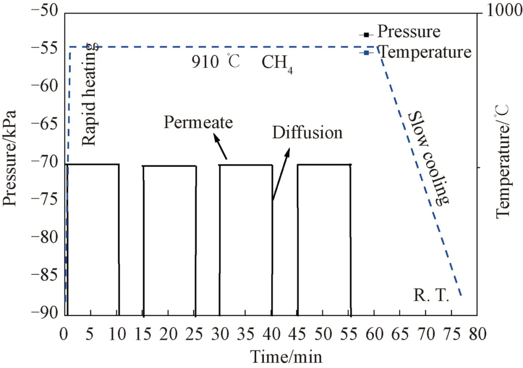 试验用材为TC6 合金(其化学成分的质量分数为Al: 5.5%~7.6%, Mo: 2.0%~3.0%,Cr:0.8%~2.3%,Fe:0.2%~0.7%,Si:0.15%~0.40%,C≤0.10%,N≤0.05%,O≤0.15%,H≤0.015%和余量Ti),样品规格为 Φ15 mm × 5 mm。在试样进行渗碳处理前,先对其表面进行打磨、抛光和清洗。渗碳工艺如图1 所示,将试样放入感应加热反应炉内进行真空处理,加热试样至目标温度,使用-70 kPa的CH4 作为渗碳介质,进行10 min的强渗及5 min扩散的交替式循环处理1 h,结束后随炉冷却至室温取样。