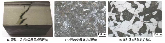 图14 裂纹中保护渣及周围增碳形貌及显微组织