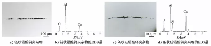 图7 轧制态链状铝酸钙夹杂物及条状硅铝酸钙夹杂物的微观形貌及EDS谱