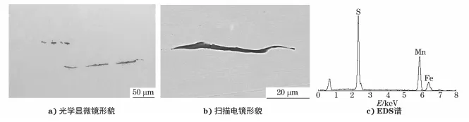 图2 细条状硫化物夹杂物的微观形貌及EDS谱
