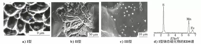 图1 连铸坯断口上不同铸态硫化物夹杂微观形貌及Ⅰ型铸态硫化物的EDS谱