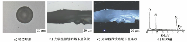 C类夹杂物是硅酸盐类夹杂物,硅酸盐夹杂物在显微镜下的光学特征是黑色或深灰色,在暗场下呈透明特征。玻璃质的硅酸盐塑性较好,在高温轧钢过程中球形夹杂物沿纵向变形延伸呈条状分布,具有延展性,见图4。