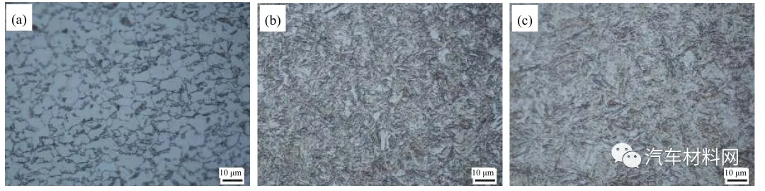 图11 热冲压成形后母材及焊缝微观组织。(a)CR340LA;(b)焊缝;(c)AC1800HS