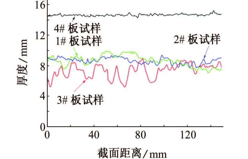 对图4中各试样腐蚀面(面向沥青混凝土路面侧)的轮廓进行扫描,截取典型截面轮廓线如图8所示。可以看出,4号未服役桥面板试样的厚度较均匀,腐蚀程度较轻;相比之下,1~3号桥面板试样上表面呈现较大的高度差。其中3号试样的腐蚀最为严重,平均厚度仅为6mm。这主要是由于桥面交变载荷引起铺装层开裂,该悬索桥服役环境为亚热带海洋大气环境,含Cl-较多的雨水随裂缝渗入沥青底部与桥面板上表面接触,桥面板发生腐蚀病害。