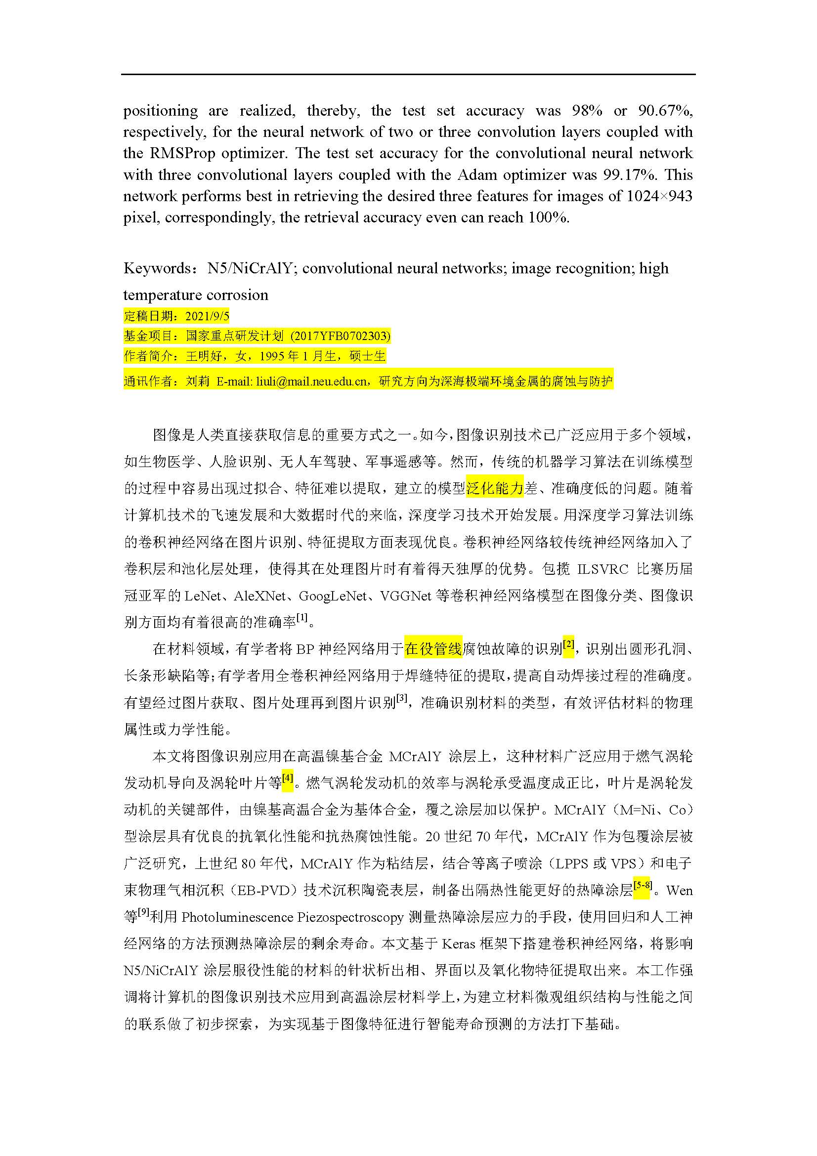基于深度学习方法的 N5/NiCrAlY 涂层图像识别的研究