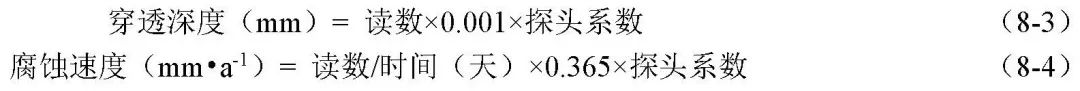 平衡电位器是这样选择的,其刻度范围为0~1000,此范围与探头元件的有效金属损失相对应。例如,一个丝状探头元件,厚2.0mm,此探头的有效厚度损失为1.0mm,这相当于在元件周围0.5mm的穿透深度。因而,将0.5mm的金属损失与平衡电位器上刻度的变化相对应,经过一段时间之后的穿透深度(总腐蚀)或者平均腐蚀速度可由下述关系确定: