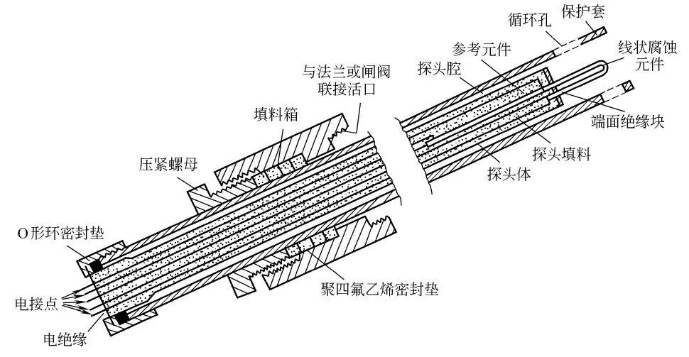 c.探头位置。探头应放在能模拟所需试验条件的位置上。重要的参数是温度和流速。要避免高速流体直接冲刷探头,除非磨损腐蚀效应是所要研究的目的。假如流体速度可能有重要影响,则可以采用与容器表面贴平安装的平嵌式探头来获得更为精确的结果。