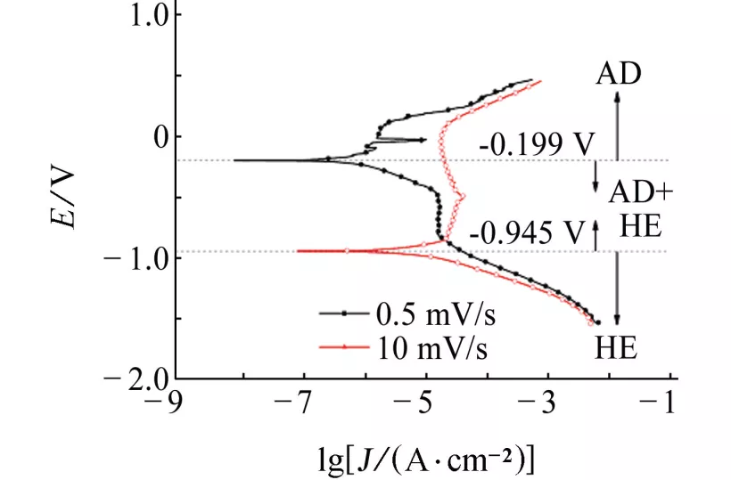 电位在-0.945~-0.199V之间的区域,有可能同时发生阳极溶解(AD)和氢致断裂(HE)。
