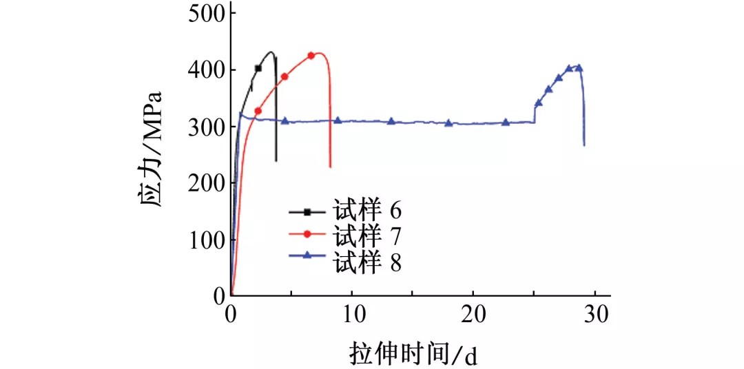 由图4和5可见,6~8号试样的断裂时间依次增加;6号和7号试样的断口颈缩明显,8号试样的断口颈缩不明显。