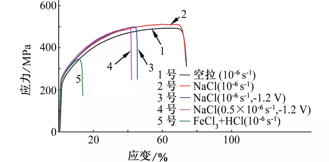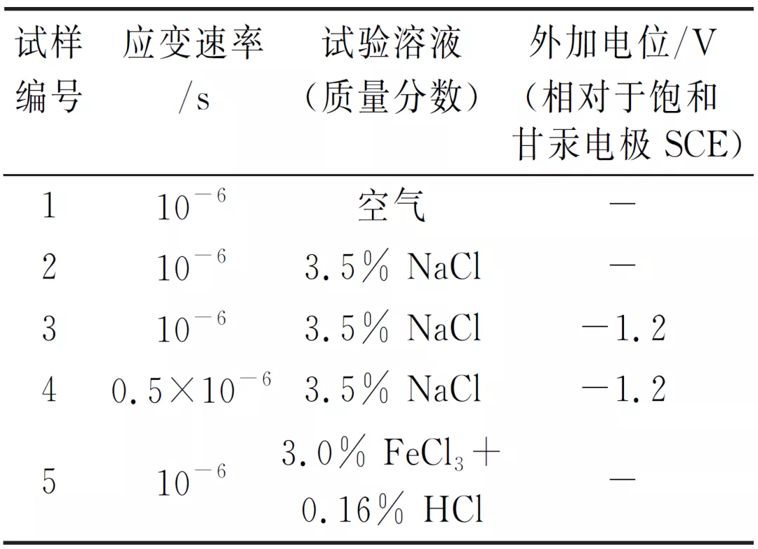 SSRT试验在定制的应力腐蚀拉伸机上进行,拉伸机的最大载荷为300kN。然后,根据小试样试验结果,择优选取试验溶液用于大试样试验。试验溶液由分析纯级试剂和蒸馏水配制。
