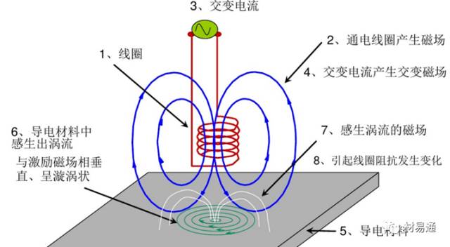 当载有交变电流的检测线圈靠近导电材料时,由于线圈磁场的作用,材料中会感生出涡流。涡流的大小、相位以及流动方式等受到材料导电性能的影响,而涡流产生的反作用磁场又使检测线圈的阻抗发生变化,因此,通过测定检测线圈阻抗的变化,可以发现试件的缺陷。