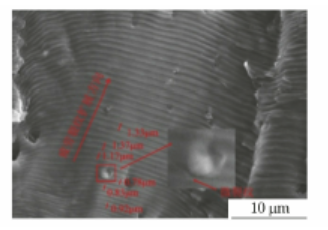 疲劳条带间围绕二次相的微裂纹形貌如图10所示,该微裂纹的长度约为2μm。根据图中单个疲劳条带的宽度和式(5)可以推断出疲劳裂纹扩展速率。