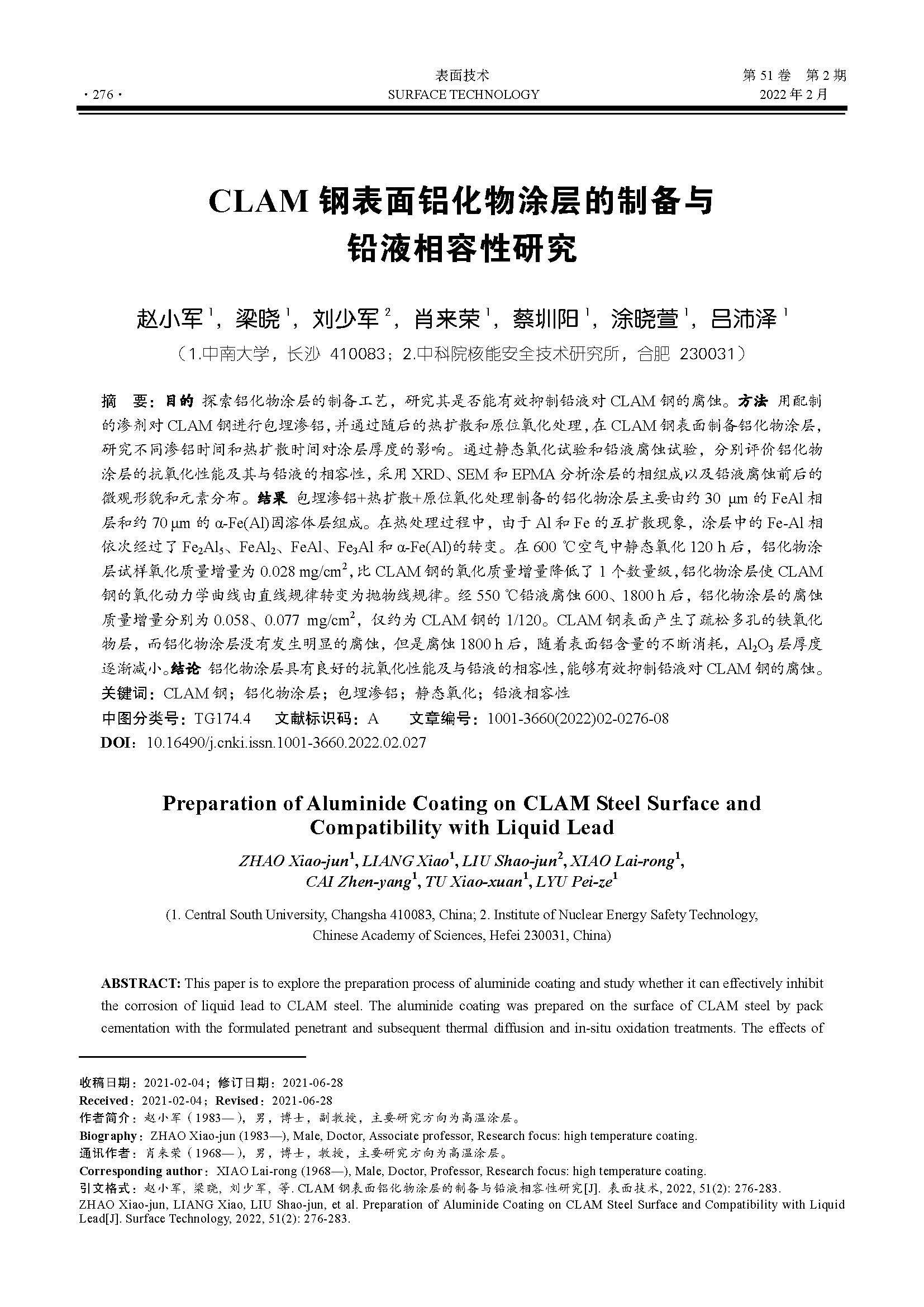 CLAM 钢表面铝化物涂层的制备与铅液相容性研究