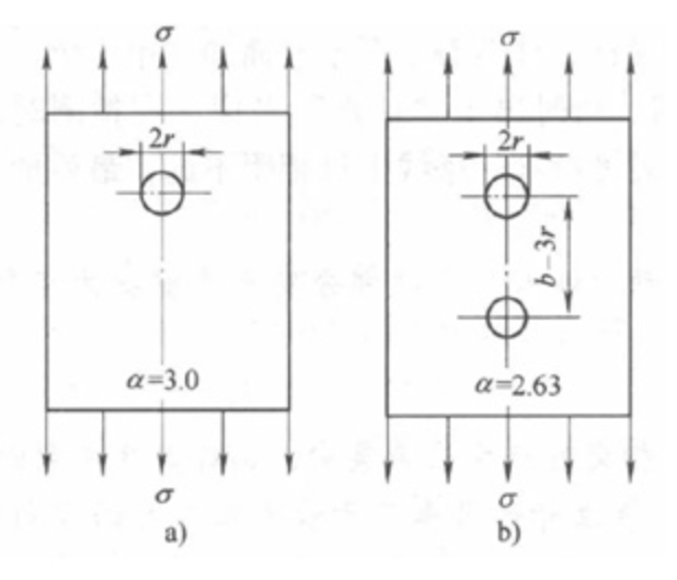 (3)在应力集中区附近的低应力部位增开缺口和圆孔这样可使应力的流线平缓,从而降低最大应力峰值。例如,图a所示的应力集中系数为3,而图b所示的应力集中系数为2.63。